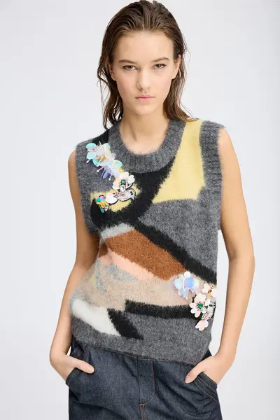 Fallegt prjónavesti frá Munthe. Módelið er 180 cm og notar stærð 36.