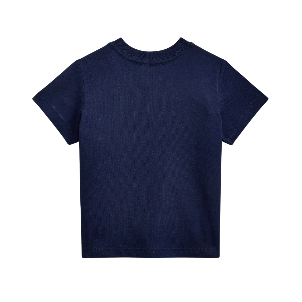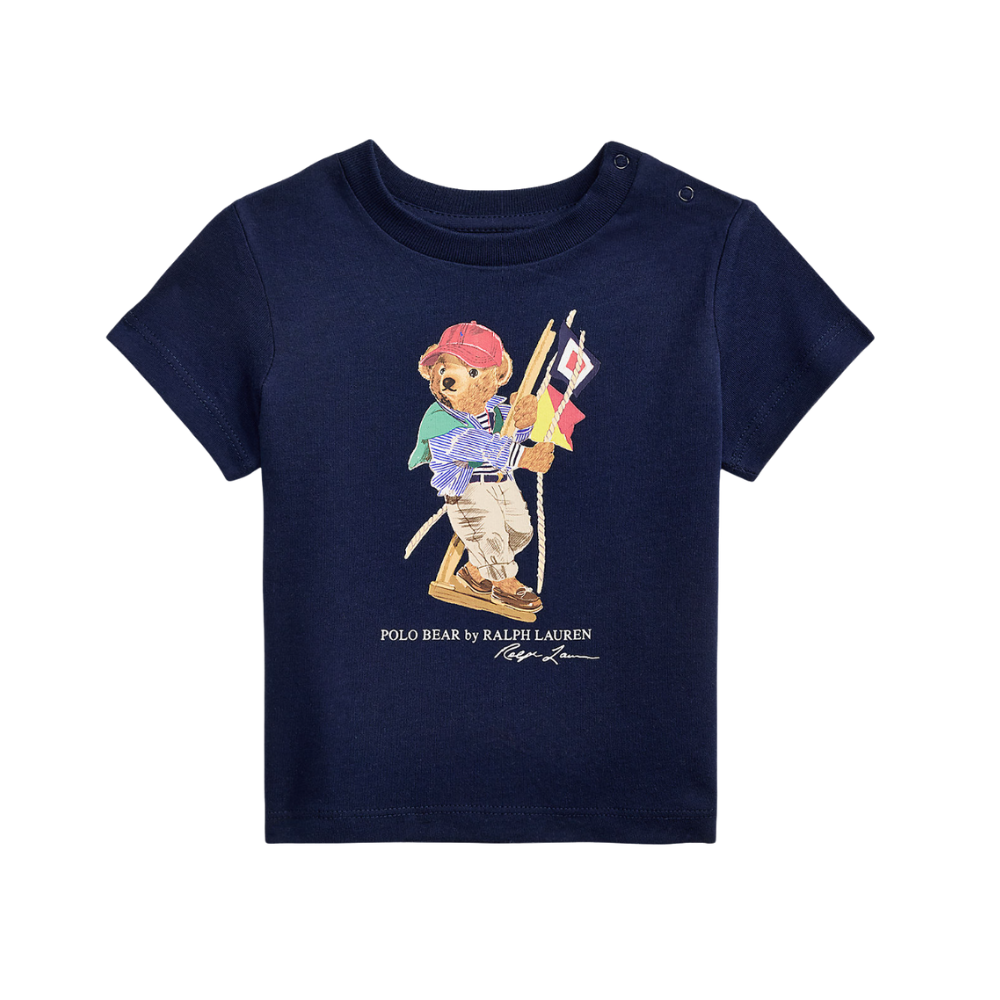 Dökk blár stuttermabolur frá Polo Ralph Lauren með bangsamynd að framan. 100% bómull.