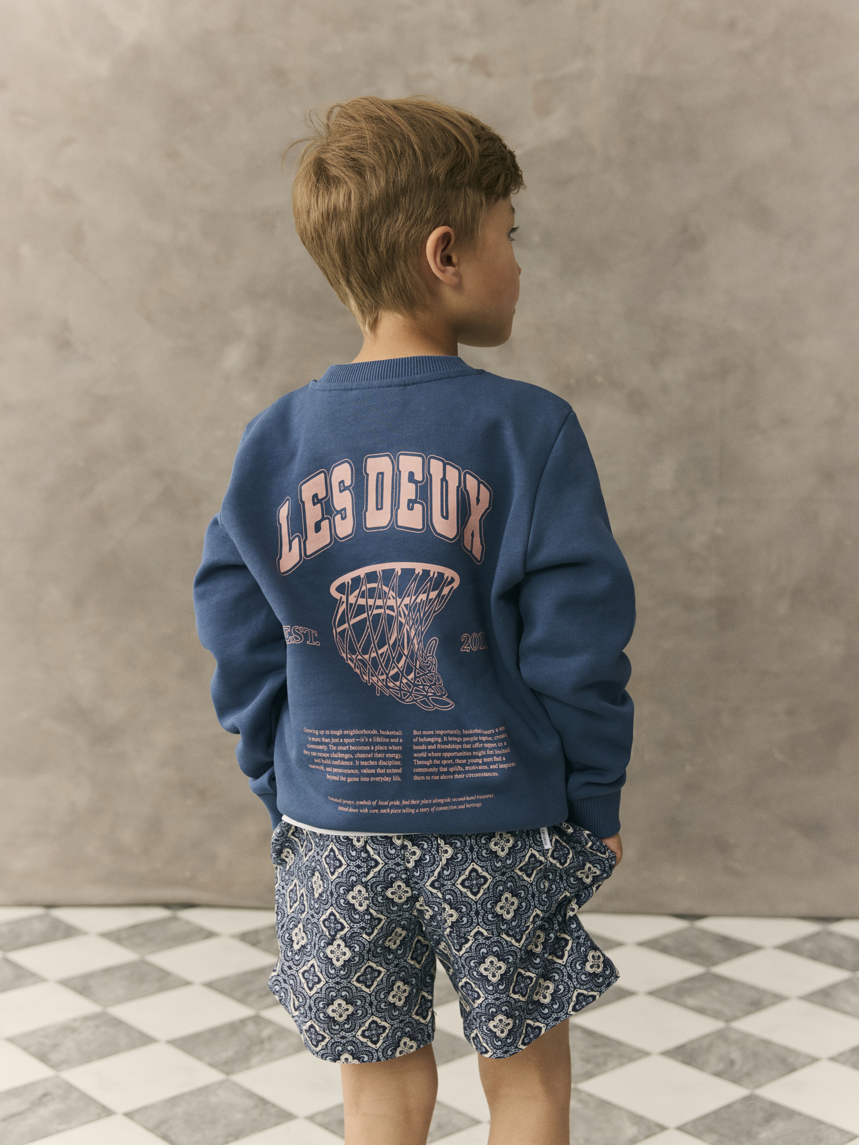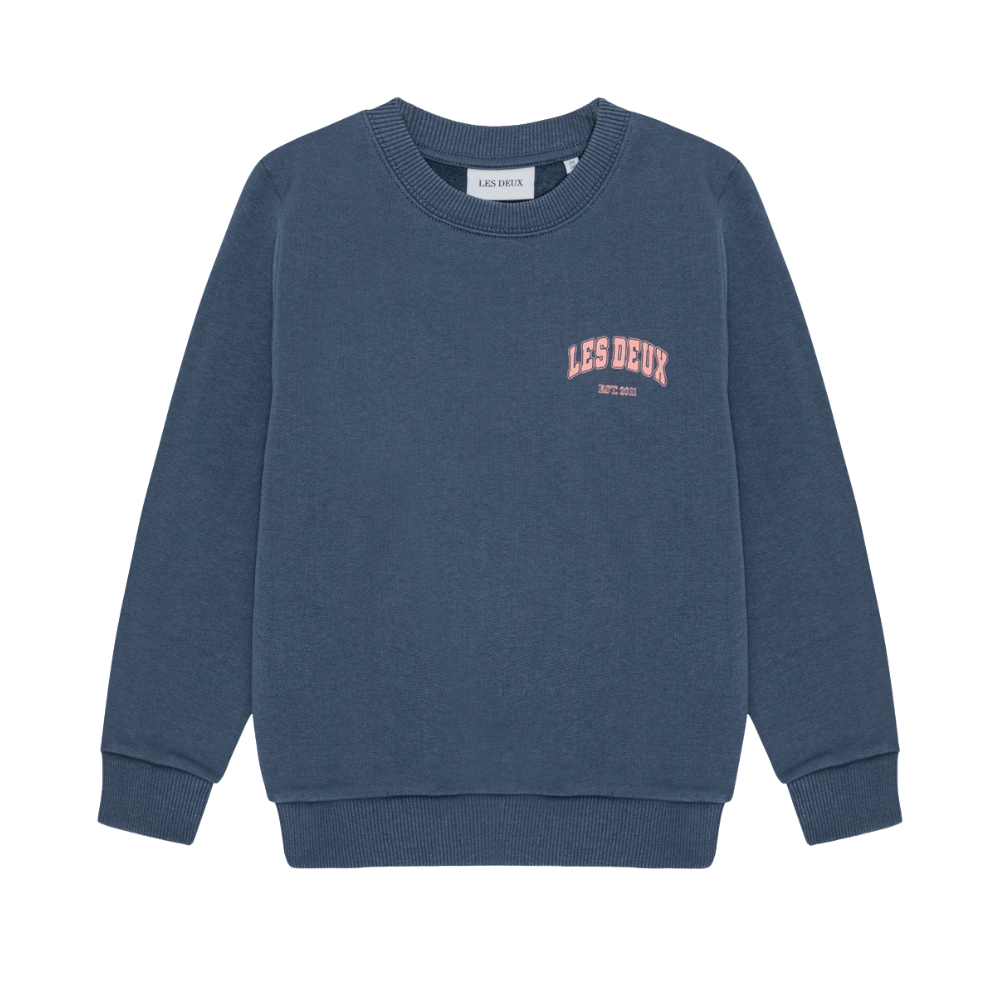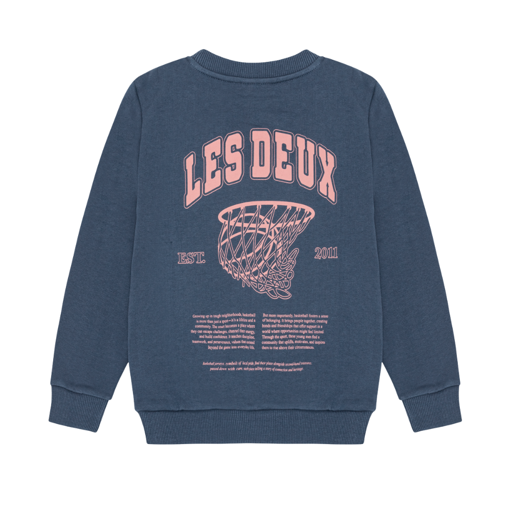 Blá peysa frá Les Deux með logo að framan og stórri mynd að aftan. Stroff við ermar og mitti. 100% bómull.
