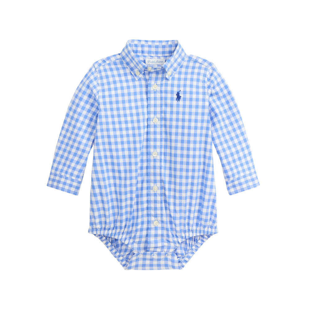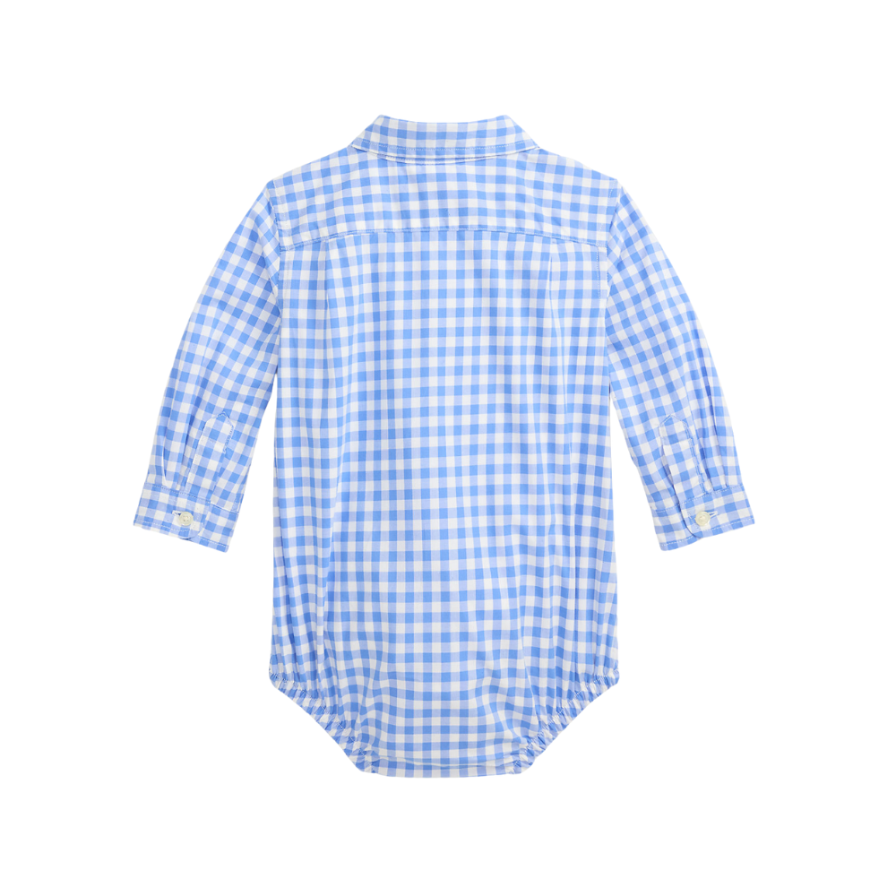 Ljósblá, köflótt samfella með löngum ermum frá Polo Ralph Lauren. 100% bómull.